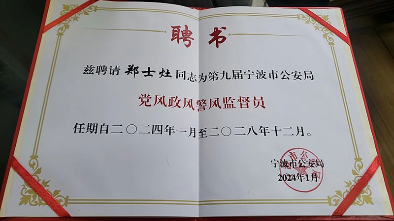 恒厚集團董事長鄭士灶表示,自恒厚集團創(chuàng)建三十三年以來,一直堅定信仰,牢記黨的紀律,本次被聘任為第九屆寧波市公安局黨風(fēng)政風(fēng)警風(fēng)監(jiān)督員,定不負所望,切實履行好監(jiān)督員職責(zé),主動建言獻策,為我市公安工作向上發(fā)展做出積極貢獻。